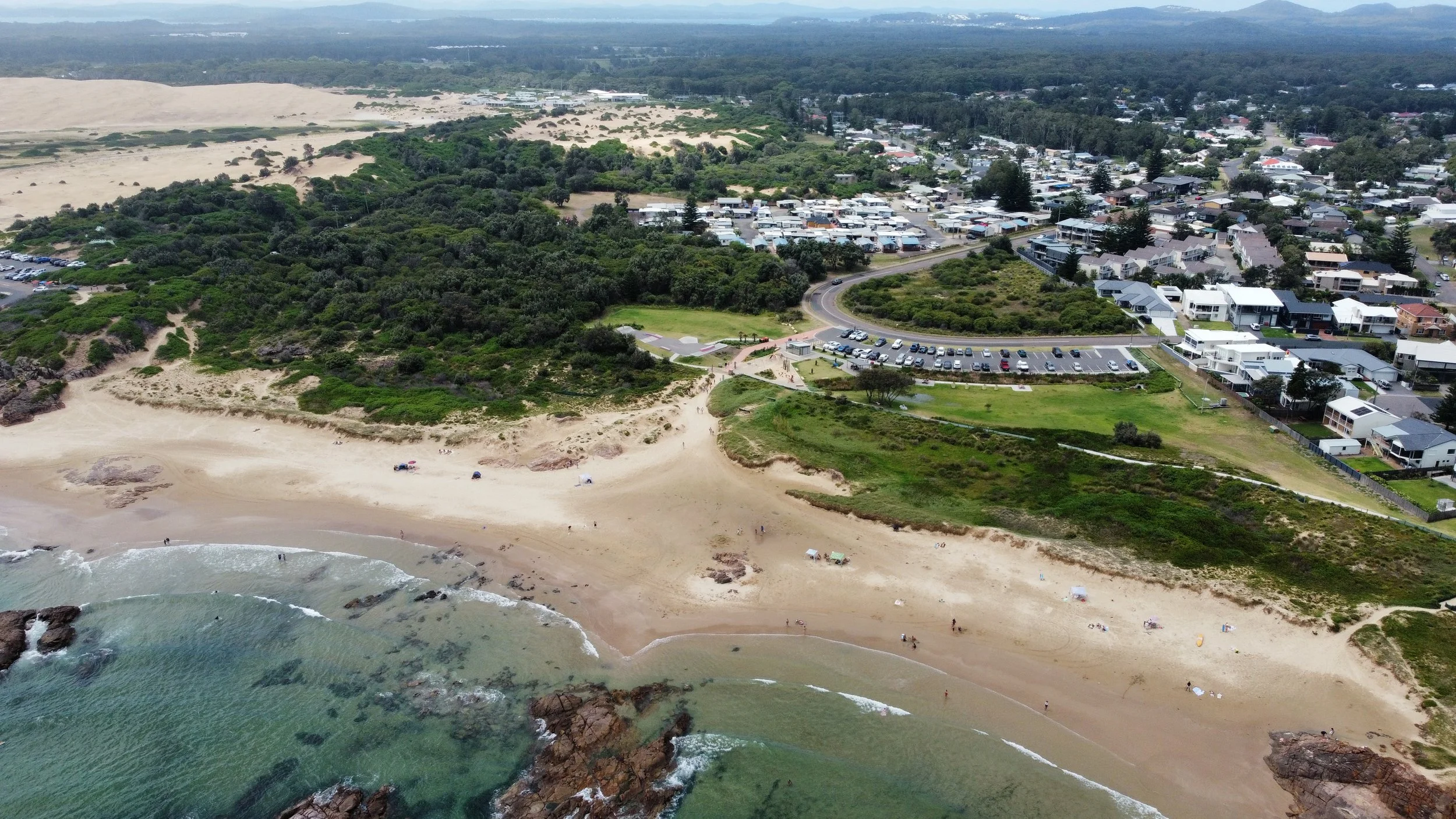 The cycleway that runs adjacent to the park connects Birubi Beach Surf Club to the Iris Moore rock pools. It makes a scenic trail to enjoy past aboriginal middens, the rocky shore line, wildlife and of course the sweeping views of the Stockton Beach sand dunes.